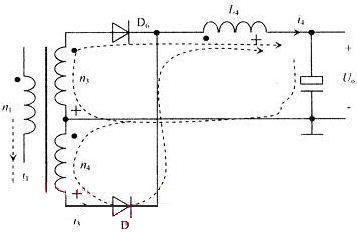 DC-DC改換后的整流管運(yùn)用了三只:D5,D6和D7,沒(méi)有獨(dú)立設(shè)置續(xù)流二極管,不同于其他電源電路。D5為續(xù)流而設(shè)置的復(fù)用二極管,D6和是正鼓勵(lì)脈沖整流二極管,D7是反鼓勵(lì)電壓整流二極管。L4是DC-DC改換后的第一級(jí)濾波電感。在正鼓勵(lì)期間,變壓器輸出繞組n3經(jīng)D6,L4輸出電流,第一級(jí)濾波電感L4中電流i4增大,同時(shí),變壓器自身利益的鼓勵(lì)磁電流i1也在增大。